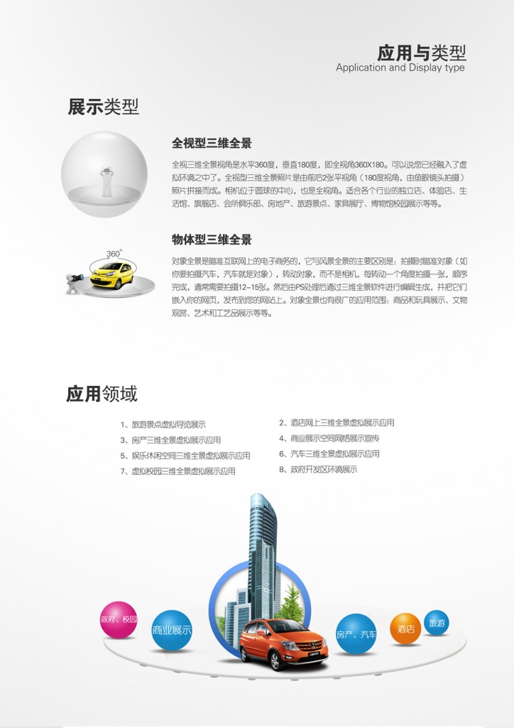 1、360全景制作:家具家居、酒店宾馆、房地产、汽车、市政工程、旅游景点、展会、医院、工厂车间、机场港口、养殖加工场、学校等;